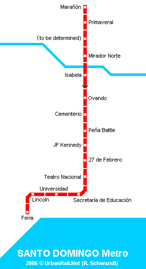 Станции 1-4 - надземные (1. Maranon, 2. Primaveral, 3. не названа, 4. Mirador Norte), станция 5 - на уровне улиц (5. Isabela), а станции 6-15 - под землёй 6. Ovando, 7. Cementerio, 8. Pena Battle, 9. JF Kennedy, 10. 27 de Febrero, 11. Teatro Nacional, 12. Secretaria de Educacion, 13. Universidad, 14. Lincoln, 15. Feria).