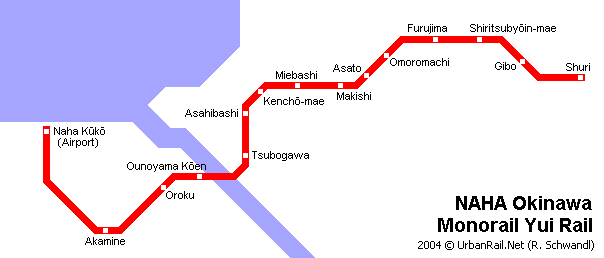 Naha Kuko (Аэропорт) - 1950 м - Akamine - 760 м - Oroku - 970 м - Ounoyama Koen - 840 м - Tsubogawa - 810 м - Asahibashi - 580 м - Kencho-mae - 720 м - Miebashi - 980 м - Makishi - 590 м - Asato - 750 м - Omoromachi - 1010 м - Furujima - 920 м - Shiritsubyoin-mae - 960 м - Gibo - 1000 м - Shuri.